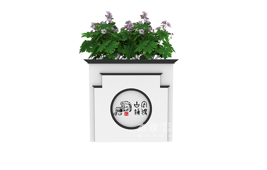 這款花箱也運(yùn)用了大家熟悉的元素——馬頭墻。但是設(shè)計(jì)師又精心設(shè)計(jì)過,使得花箱更加具有輕盈的美感。另外還加入了漏窗、書法藝術(shù),平添了文化氣息。