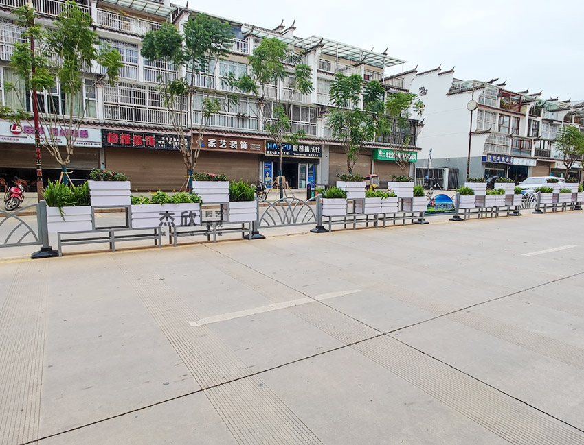 pvc品字形組合花箱護(hù)欄非常適合城市道路中央隔離帶、機(jī)非隔離帶。