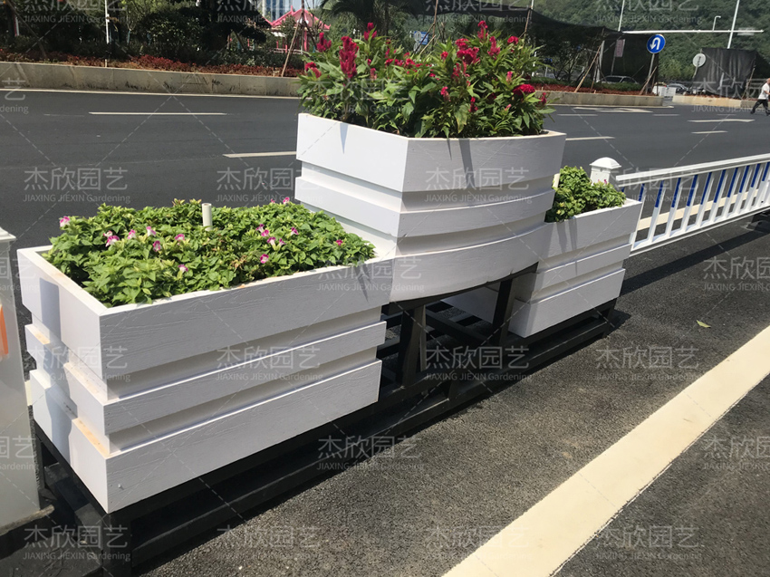 道路花箱的作用主要是提升景觀,這款花箱顏色是白色,有提亮效果,白色和各色的草花搭配自然。