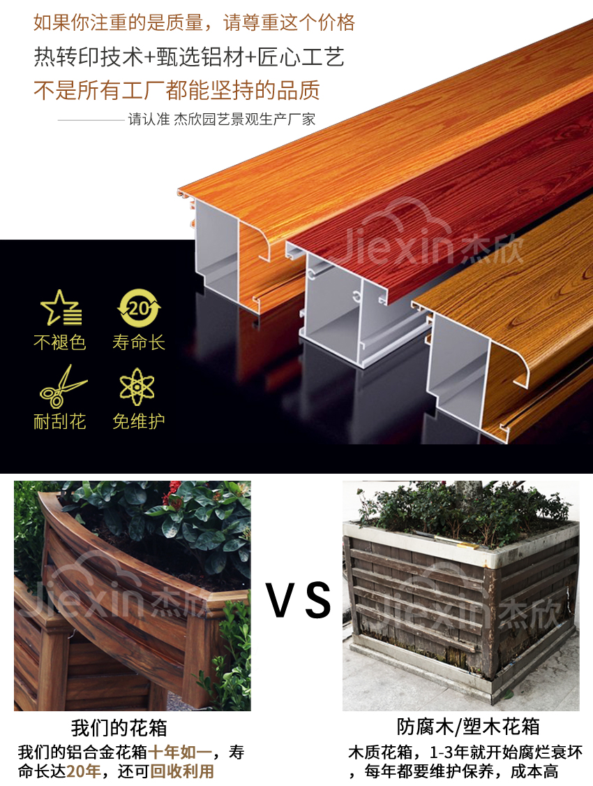 以鋁合金為花箱材料,堅固耐用,省去后期維護費用,便利實惠