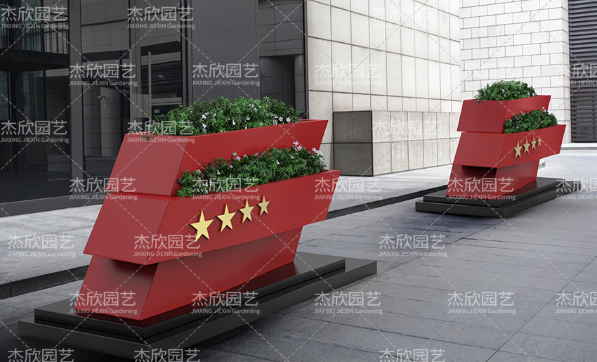 這款花箱大氣簡潔,將飄揚(yáng)的紅旗用幾何體表達(dá),造型感硬朗十足,整體造型設(shè)計表達(dá)了軍運會現(xiàn)代化賽事的特性,體現(xiàn)我國軍事的熱血、剛強(qiáng)。